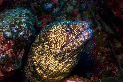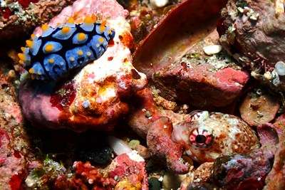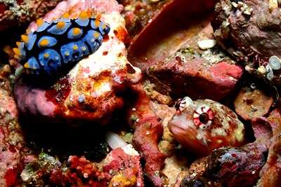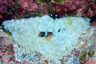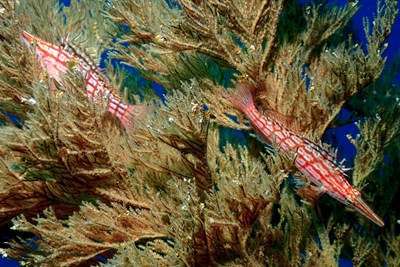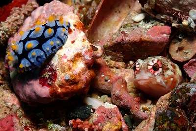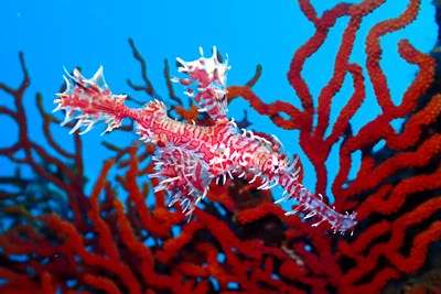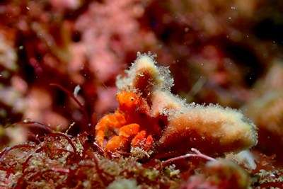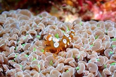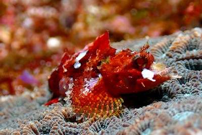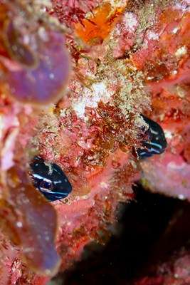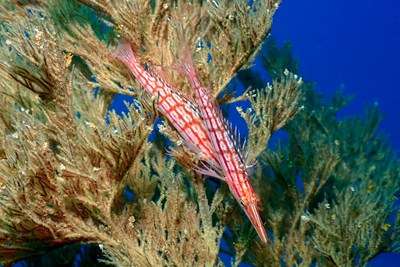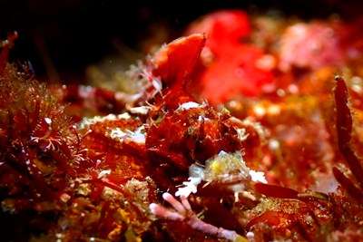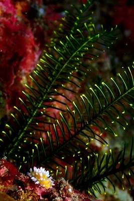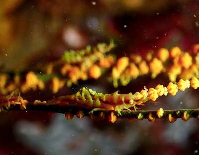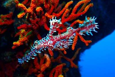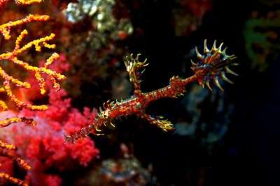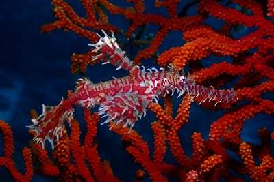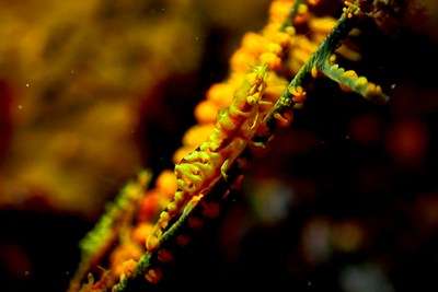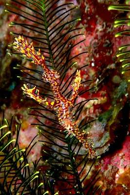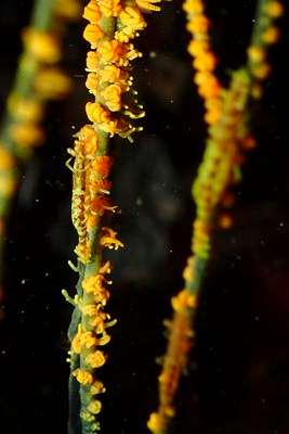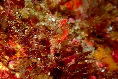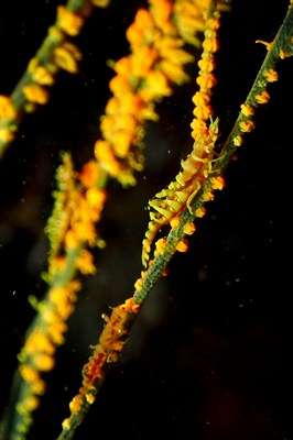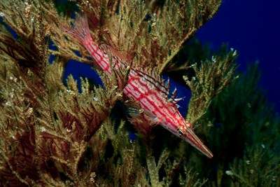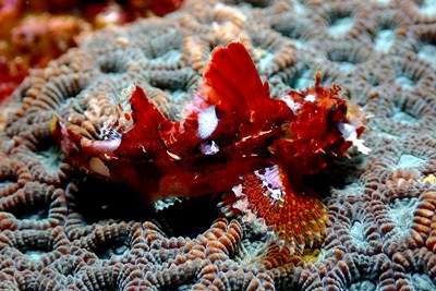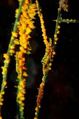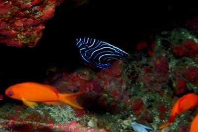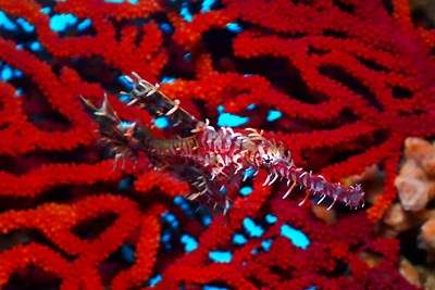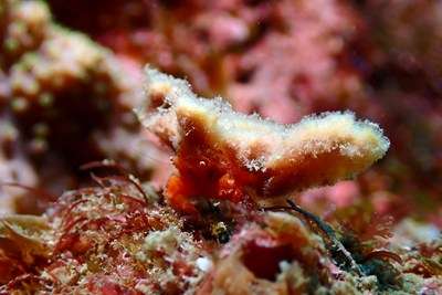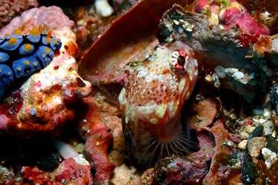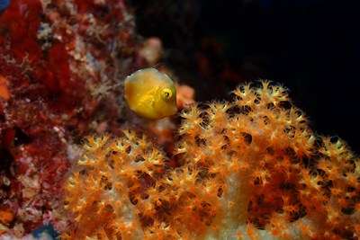 ソフトコーラルの陰に「ニシキフウライウオ」を発見。