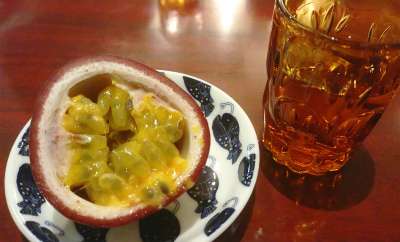 冷蔵庫内で冷やしてましたゼリー状のパッションフルーツを皮に戻しまして。