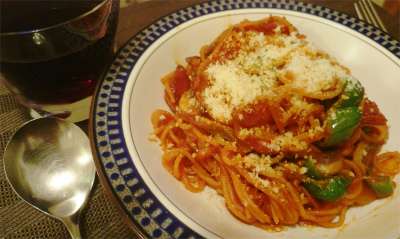 自宅でいただきます夕食は、豚肉・キムチ・キュウリ・半熟卵入り、豆ヌードル使用のビビン麺でした。