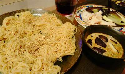 帰宅後に頂きました夕食は、豆ヌードル使用の素麺のつけ麺風(茄子と生ハム入り胡麻だれ)でして。