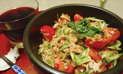 メインディッシュは、豆ヌードル仕様の夏野菜たっぷりのぶっかけ蕎麦風でした。