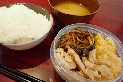 その後にいただきました朝食は、鶏むね肉の塩こうじ焼き&キノコ炒め&玉子焼きにご飯&味噌汁でした。