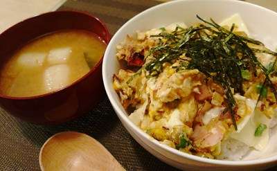 迎えました本日、自宅でいただきました朝食は豆腐・ベーコン丼でした。