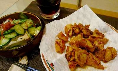 そしてキュウリ&ミョウガ乗せ豆腐に、鶏もも肉の山賊焼きでして。