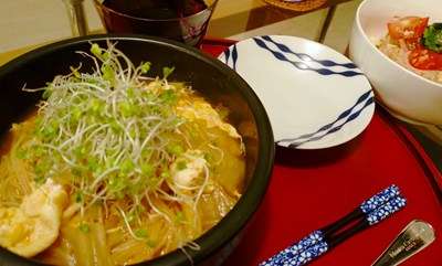 メインは!豆ヌードル使用の叉焼&キムチ&ブロッコリースプラウトの入った、辛めのにゅう麺風でした。
