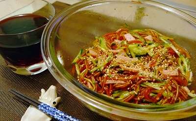 昨日の夕食、一品目は春雨・キュウリ・ハムのサラダで。