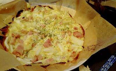 もう一品は、ベーコン&白菜を練りこみました餃子の皮を用いたピザ風でして。