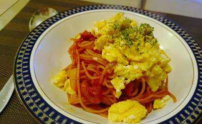堂丸特製・豆ヌードル使用のスクランブルエッグを乗せました、ナポリタンスパゲティでした。