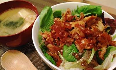 迎えました本日、自宅でいただきました朝食はベビーリーフ入り豚肉丼&味噌汁でして。