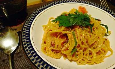 豆ヌードル使用の、堂丸特製・明太子スパゲッティでして。