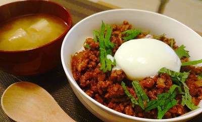 半熟卵と大葉の入った豚ミンチ丼に、味噌汁でした。