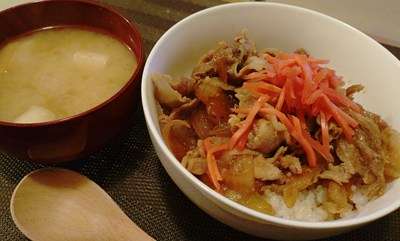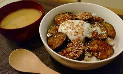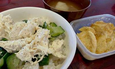 店内カウンター席にていただきます朝食は、蒸し鶏のむね肉&キュウリ丼・玉子焼きに味噌汁でして。