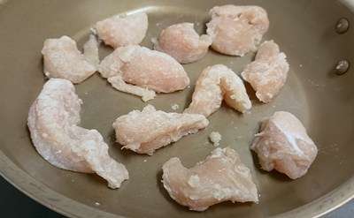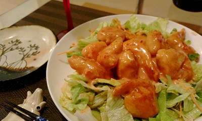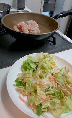 レタスとニンジンのサラダに乗せて出来上がりました鶏肉のエビマヨ風です。