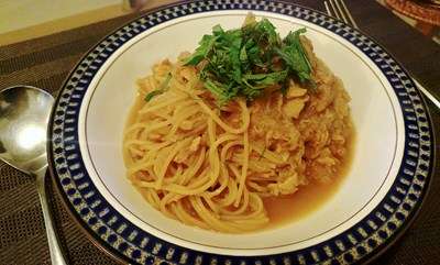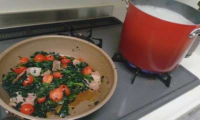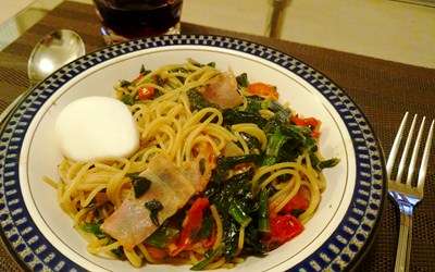これまたおなじみの、豆ヌードル使用のほうれん草・トマト・ベーコン・半熟卵が具材の和風スパゲッティでして。