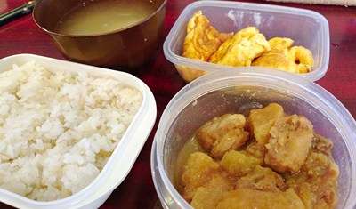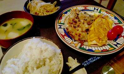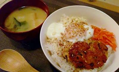 そして、迎えました本日の自宅での朝食は鶏ミンチバーグ丼&味噌汁でした。
