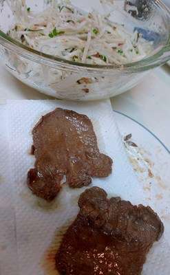 大根・キュウリ・もやしのサラダに合わせて牛タンを焼き上げまして。