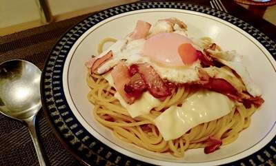 豆ヌードル使用の、ハム&目玉焼き&チーズを混ぜ合わせました塩焼きそば風でした。