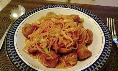 毎度おなじみ豆ヌードル使用の、肉だんごたっぷりの塩焼きそば風でして。