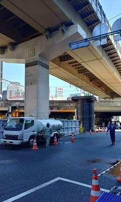 この影響で近くを走る新御堂筋は、北行きは曽根崎東から鶴野町北まで、南行きは豊崎4西の交差点から曽根崎東までが通行止めになっています。』