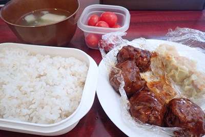 出勤後にいただきました朝食は、昨日「Yo-ko さん」が差し入れて下さいました551シリーズの肉だんご&海老焼売、ミニトマト、ごはん&味噌汁でした。