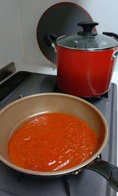 トマトソースを温め、豆ヌードルを湯がきまして。