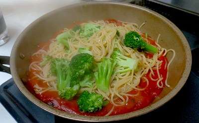 ソースに豆ヌードルとブロッコリーを投入。