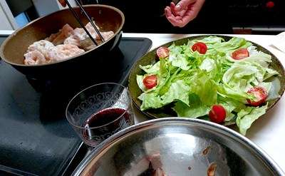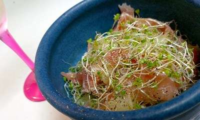 合わせます料理は生ハム・ブロッコリースプラウト・缶詰のグレープフルーツを混ぜ合わせて味付けしましたサラダでして。