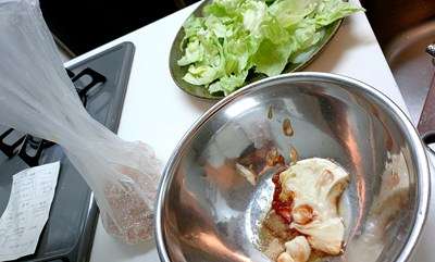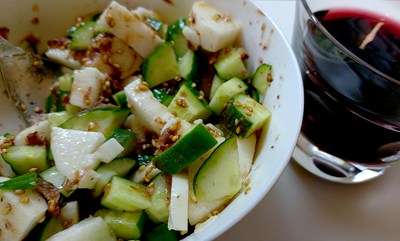 帰宅後の夕食は、キュウリと長芋のサラダに。
