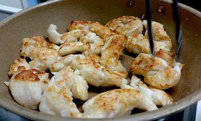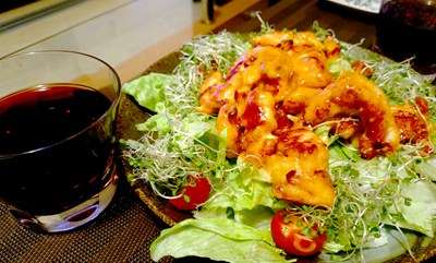 海老マヨ風味に味付けしました鶏ささみ料理の出来上がり。