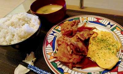 豚肉炒め&玉子焼き、ごはんに味噌汁でした。