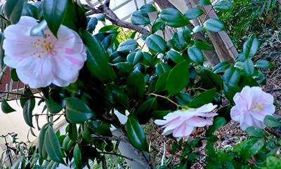 今朝も出勤前に自宅マンション前の植え込みを見てましたら、五色八重散椿の花が増えてました。