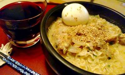 豆ヌードル使用の具だくさん豆乳塩ラーメンをいただき。