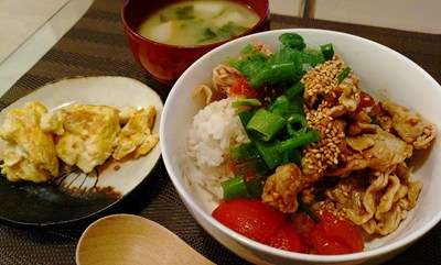 迎えました本日は豚肉&トマト&ネギ丼、味噌汁、玉子焼きが朝食でした。