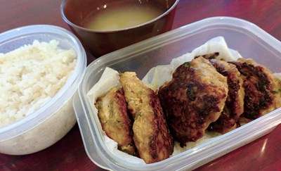で、出勤後にいただきます朝食は鶏ミンチバーグ・ごはん&味噌汁でして。