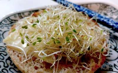 用意していましたマフィンにチーズ&ブロッコリースプラウトを乗せ。