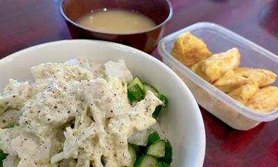 出勤後には鶏むね肉&キュウリ丼、ご飯&味噌汁でパワーチャージしまして!