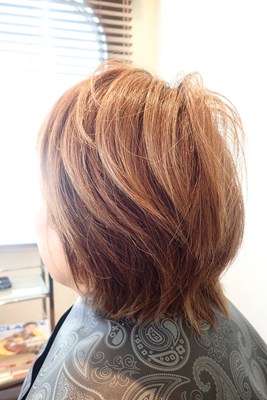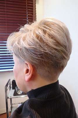 そしてカット&ハイトーン・デザインヘアカラー&トリートメントの技術で、堂丸が仕上げさせて頂きましたシャープなカットラインのヘアスタイルです。