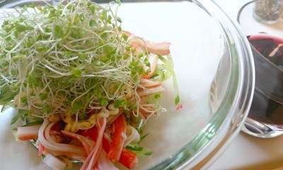 1品目はカニカマ・キュウリ・ブロッコリースプラウトのサラダで。