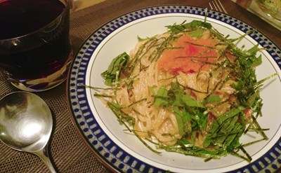 メインは豆ヌードル使用の明太子スパゲティ・大葉乗せでした。