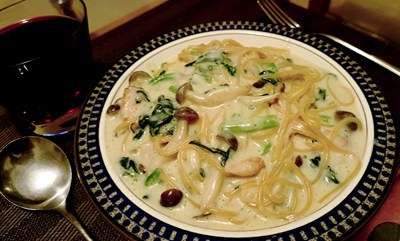 堂丸特製・豆ヌードル仕様のベーコン・しめじ・ほうれん草入りのクリームスパゲティでして。