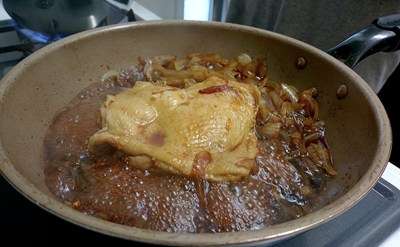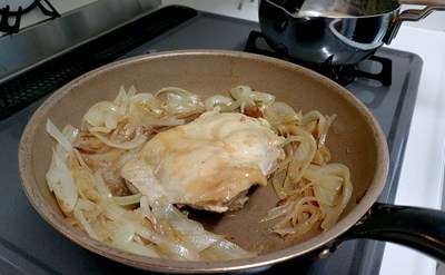 フライパンにて鶏むね肉とタマネギを炒め・・・