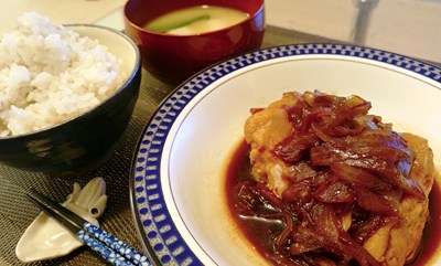 で、出勤後にいただきます朝食は鶏ミンチバーグ・ごはん&味噌汁でして。